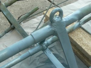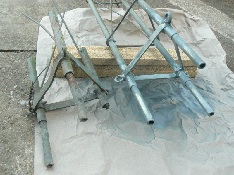 Le pylône étant tombé après un coup de vent, il a été nécessaire de refaire les éléments à grand coup de baguettes de soudure à l’arc.